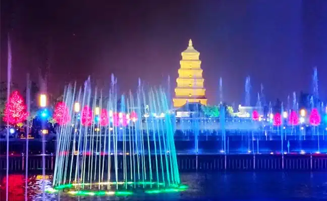 Музыкальный фонтан на Северной площади Большой пагоды диких гусей — водно-световое шоу на одной из самых больших площадей в Азии. Он размещён перед исторической пагодой VII века, но сам фонтан и площадь сформированы в последние десятилетия как центр городской вечерней жизни. Шоу сочетает хореографию воды, световые эффекты и музыку.